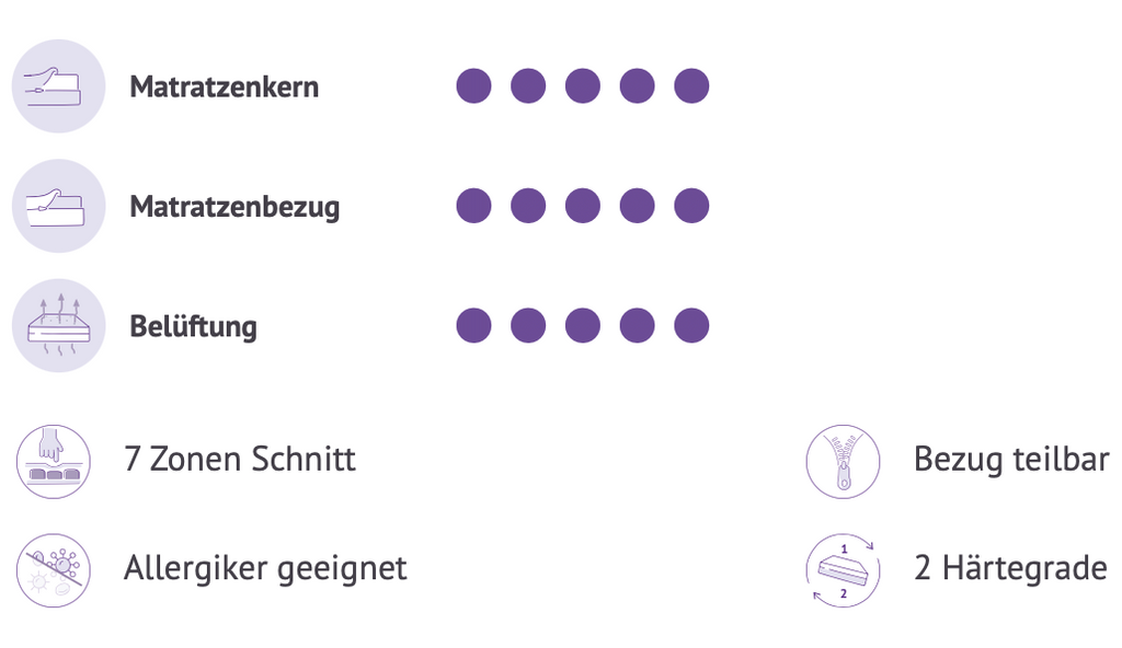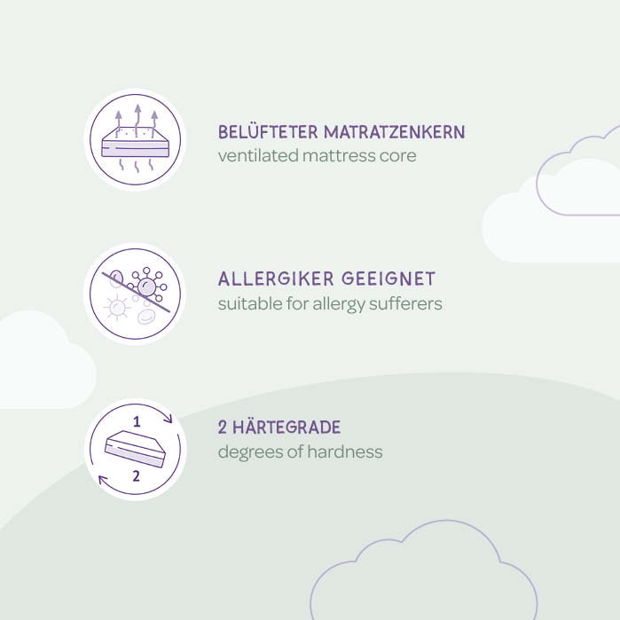 MATTRESS CORE: The allergy-friendly mattress made of highly flexible Cellpur® foam offers excellent lying comfort with unique moisture management and wave contours on both lying surfaces.