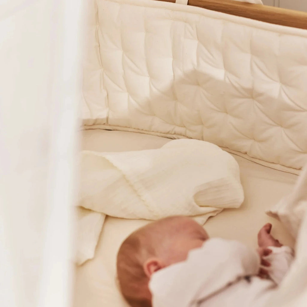 Weiches Bettnestchen in schöner Steppoptik. Mit hübschen Bändern leicht am Bett zu befestigen. In der Länge reicht das Bettnestchen ca. um die Hälfte eines Babybetts, um so die Belüftung im Bett zu gewährleisten und gleichzeitig für eine weiche und gemütliche Schlafumgebung zu sorgen.