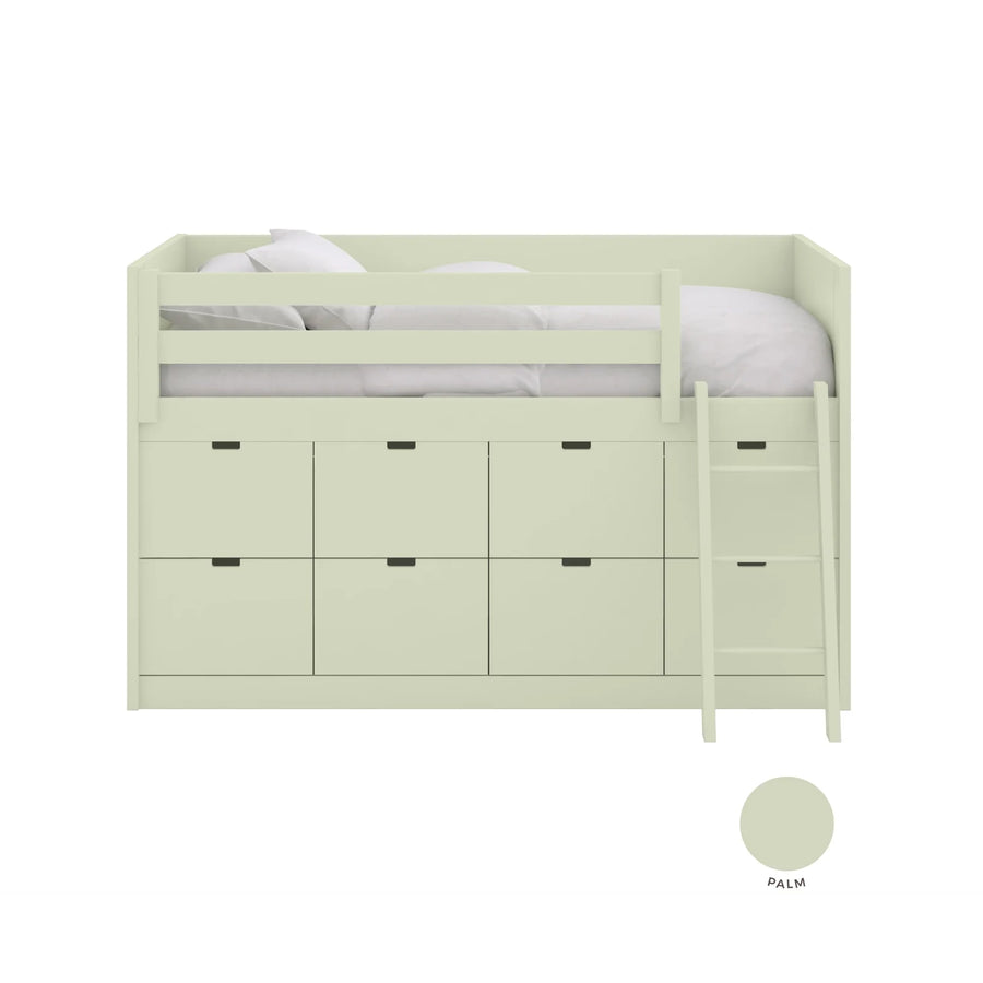 Kompakter geht es kaum! Das Bettsofa Block XL von MUBA Bespoke vereint ein Bett mit dem Matratzenmaß 90x190 cm in angenehmer Höhe mit maximalem Stauraum: acht integrierte Schubladen bieten jede Menge Platz für Spielsachen, Kleidung und alles, was sich im Kinderzimmer so findet. Die Leiter kann nach Belieben links oder rechts angebracht werden und auch ein Lattenrost ist bereits im Lieferumfang enthalten. Wie alle Möbel von MUBA Bespoke kann auch dieses Bett ganz nach Ihren Wünschen konfiguriert werden.