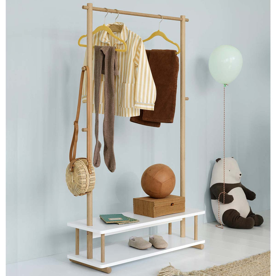 Der Camp Kleiderständer von Oliver Furniture passt perfekt zu den Betten und Möbeln aus der gleichnamigen Kollektion. Die Kleiderstange aus schön geformten Eichenrundstäben und zwei Ablageplatten bietet genügend Platz für Kleidung, Schuhe oder andere Gegenstände im Kinderzimmer oder Flur.