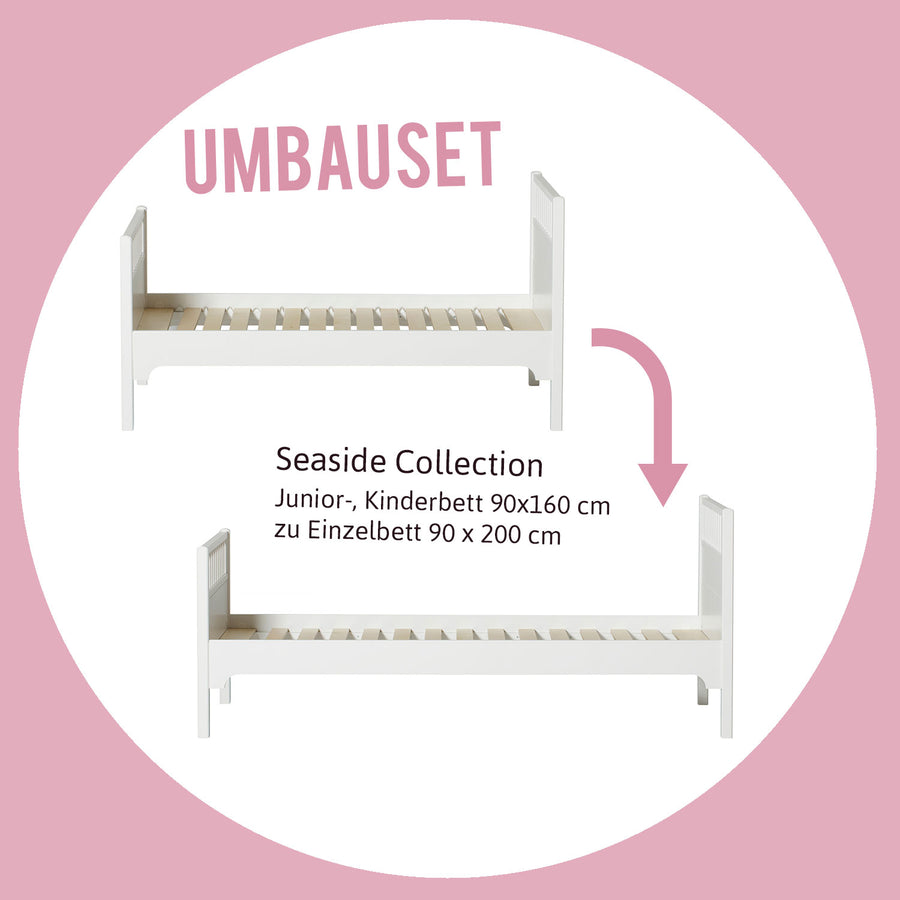 Mit dem praktischen Umbauset wird aus dem Juniorbett Seaside Classic in 90x160 cm ein Einzelbett in 90x200 cm. Hierzu werden einfach die kurzen Seitenteile durch zwei lange Seiten ausgetauscht und Voila! So kann das Bett weiterverwendet werden und verschönert dann das Jugendzimmer oder auch das Gästezimmer.