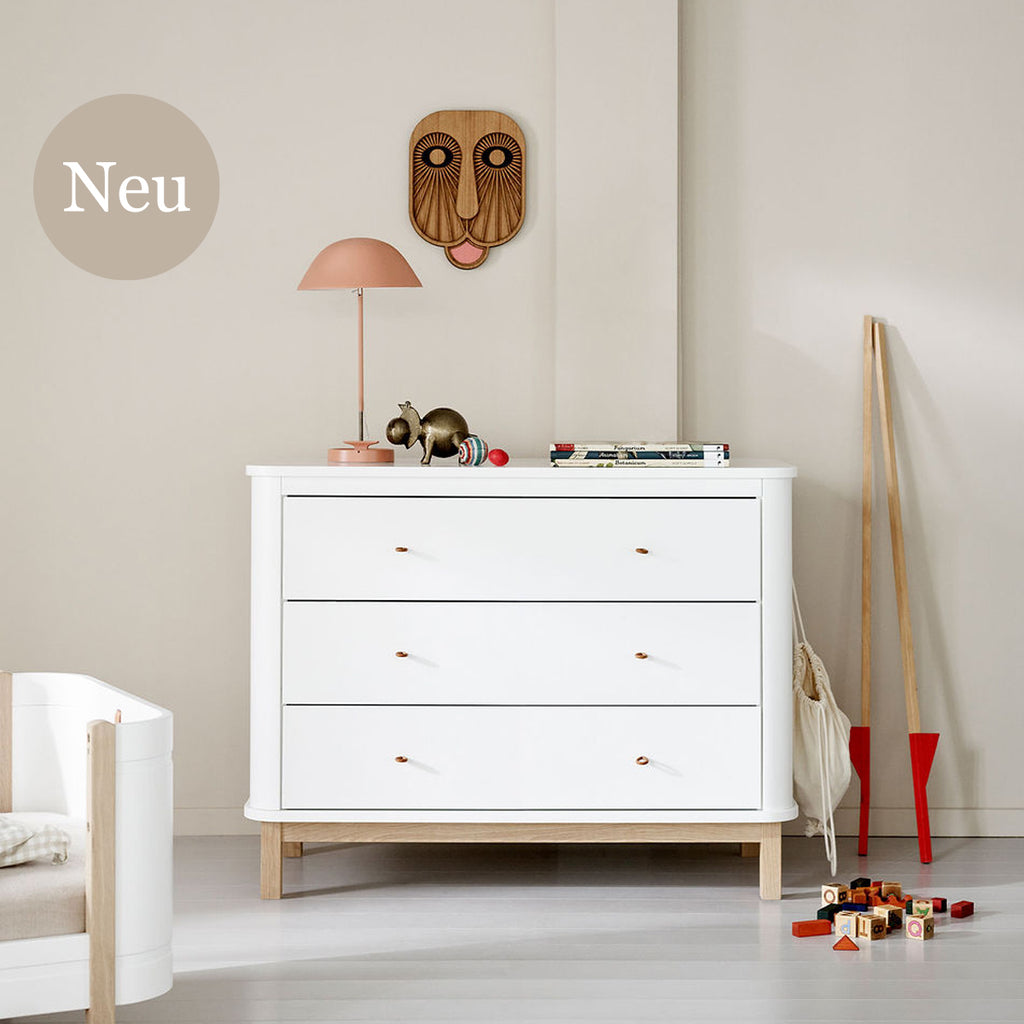 Die Wood Kommode mit ihren sanft abgerundeten Kanten – sowohl zur Wand hin als auch nach außen – bringt Wärme und natürliche Eleganz ins Kinderzimmer. Mit ihrem harmonischen Design wirkt sie leicht und freundlich – eine stilvolle Ergänzung, die sowohl funktional als auch ästhetisch überzeugt.