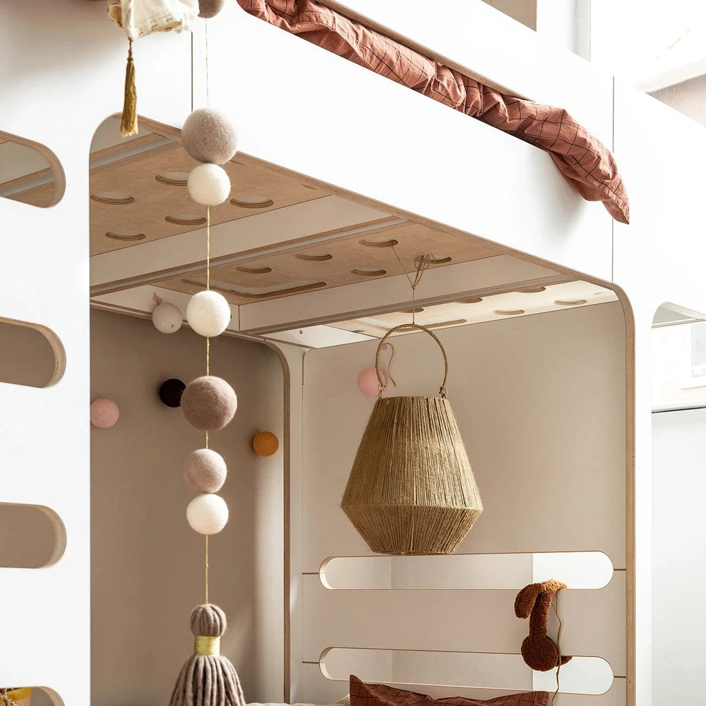 Das Bett verfügt über zwei Leitern, sodass es überall im Zimmer aufgestellt werden kann. Die geringere Höhe (162 cm, halbhohes Bett) macht es besonders sicher und ermöglicht es Eltern, ihre Kinder leicht zu erreichen und das Bett bequemer zu machen. Der Boden des Bettes hat runde Löcher für eine gute Belüftung. Ein lustiges Element, das Kinder bemerken, wenn sie darunter stehen. Keine Latten, sondern perforierte Bretter für zusätzliche Stabilität.